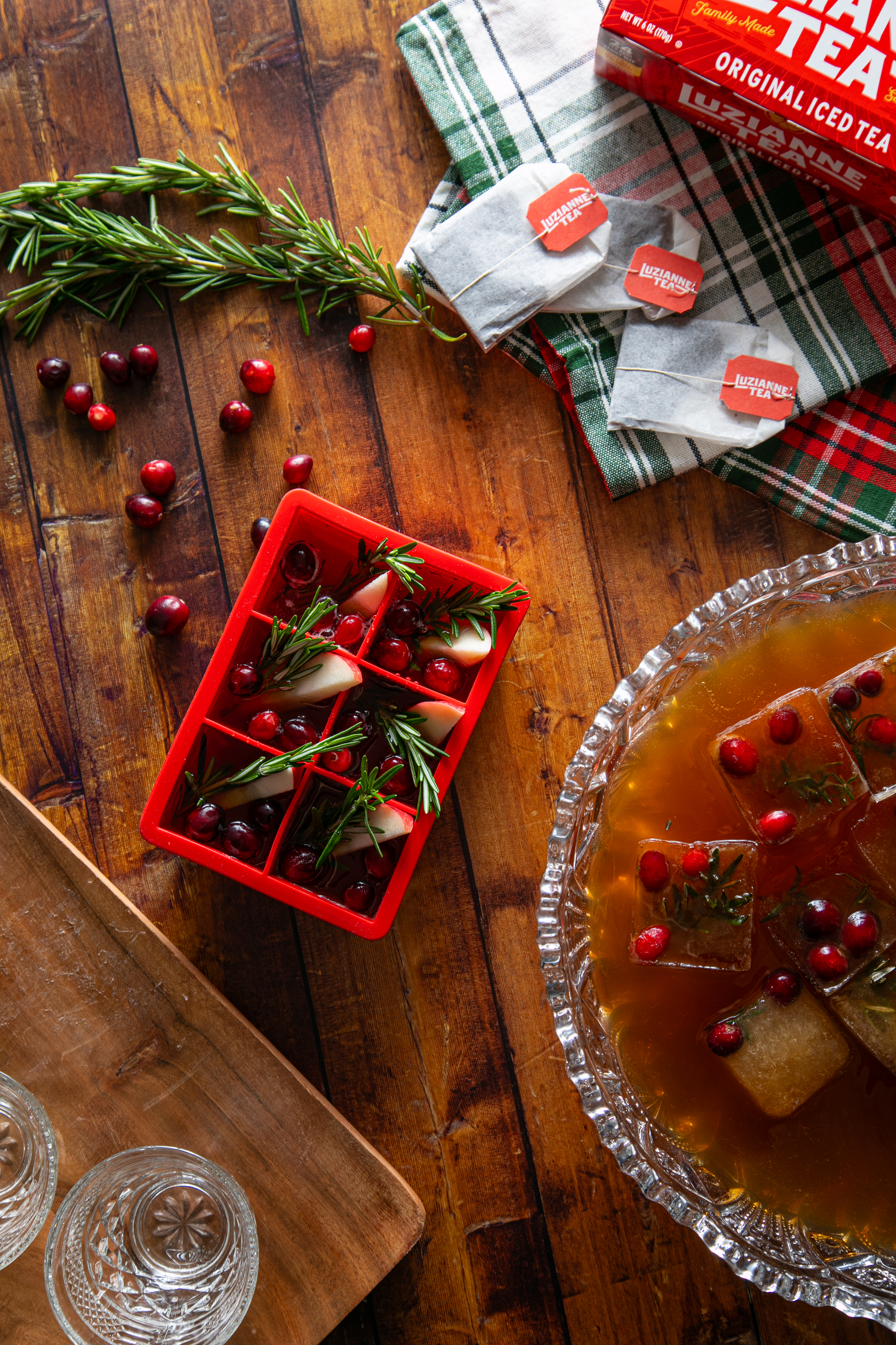 Festive ice cubes made with apple cider, Luzianne Tea, fresh fruit and sprigs of rosemary. Serve them with cocktails or in a punch bowl with our Ciderberry Tea Sparkling Punch!